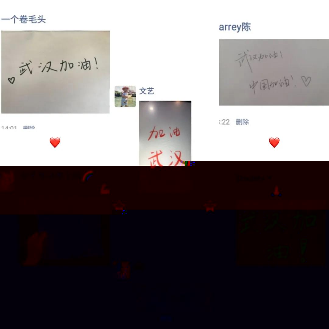 除了這樣的手寫加油之外,還有一部分同學選擇了用配圖的方式,在朋友圈内統一發上“武漢加油!中國加油!一切都會好起來的!”,我們将同學們的留言拼成了愛心的形狀。