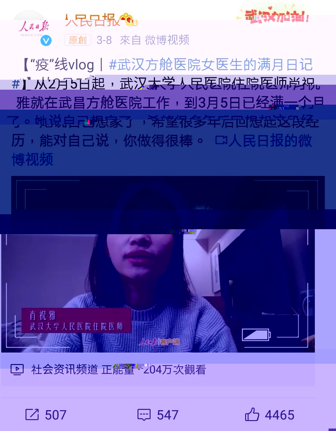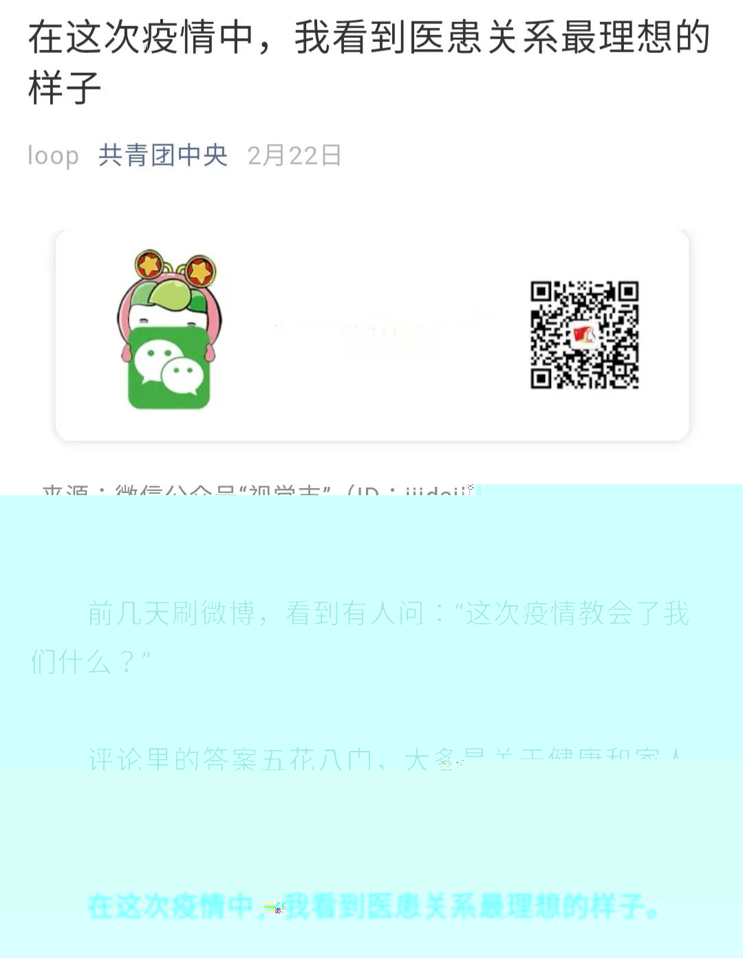 此次疫情中,醫護人員沖在最前線發揮了巨大的作用,我們看到了在武漢的方艙醫院裡醫護人員和患者相互打氣的場景,我們觀看了由人民日報微博客戶端發布的【“疫”線vlog #武漢方艙醫院女醫生的滿月日記#】,也閱讀了共青團中央發布的文章《在這次疫情中,我看到醫患關系最理想的樣子》,支部所有同學都踴躍分享他們所看到的感人事件。