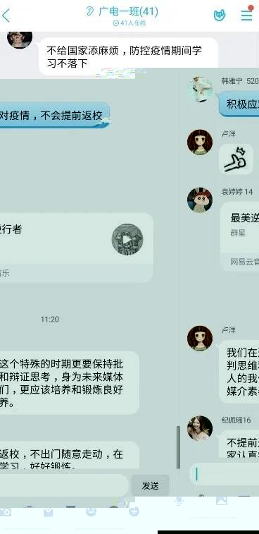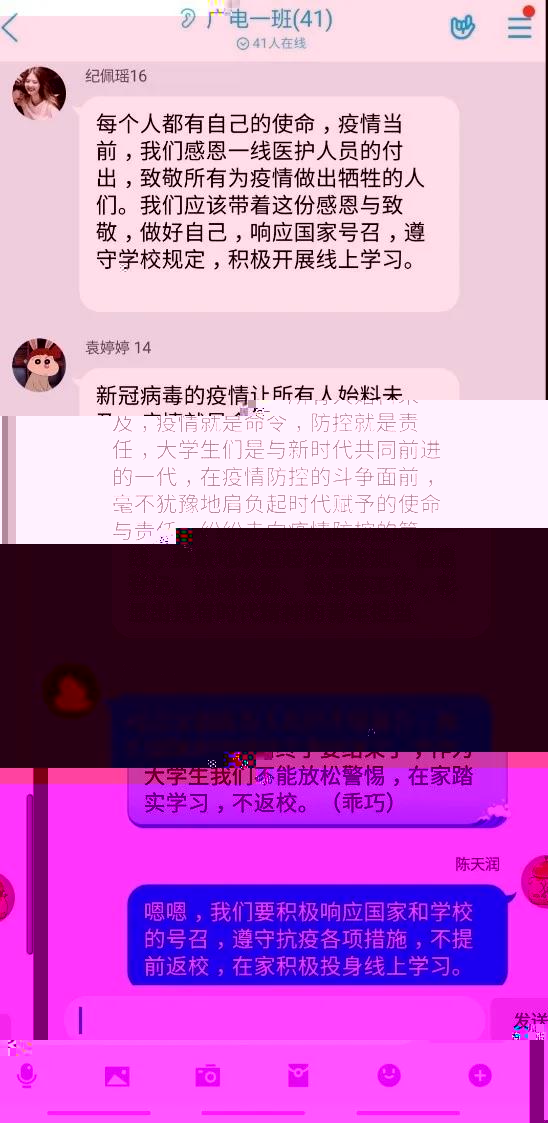 2017級廣電一班團支部組織團員開展有關“學生團員的責任”的相關話題讨論,同學們紛紛表示團員要響應國家和學校的号召,服從學校的安排,積極開展線上學習。擔起自己的一份責任,貢獻自己的一份力量,為打赢這場疫情防控阻擊戰努力!