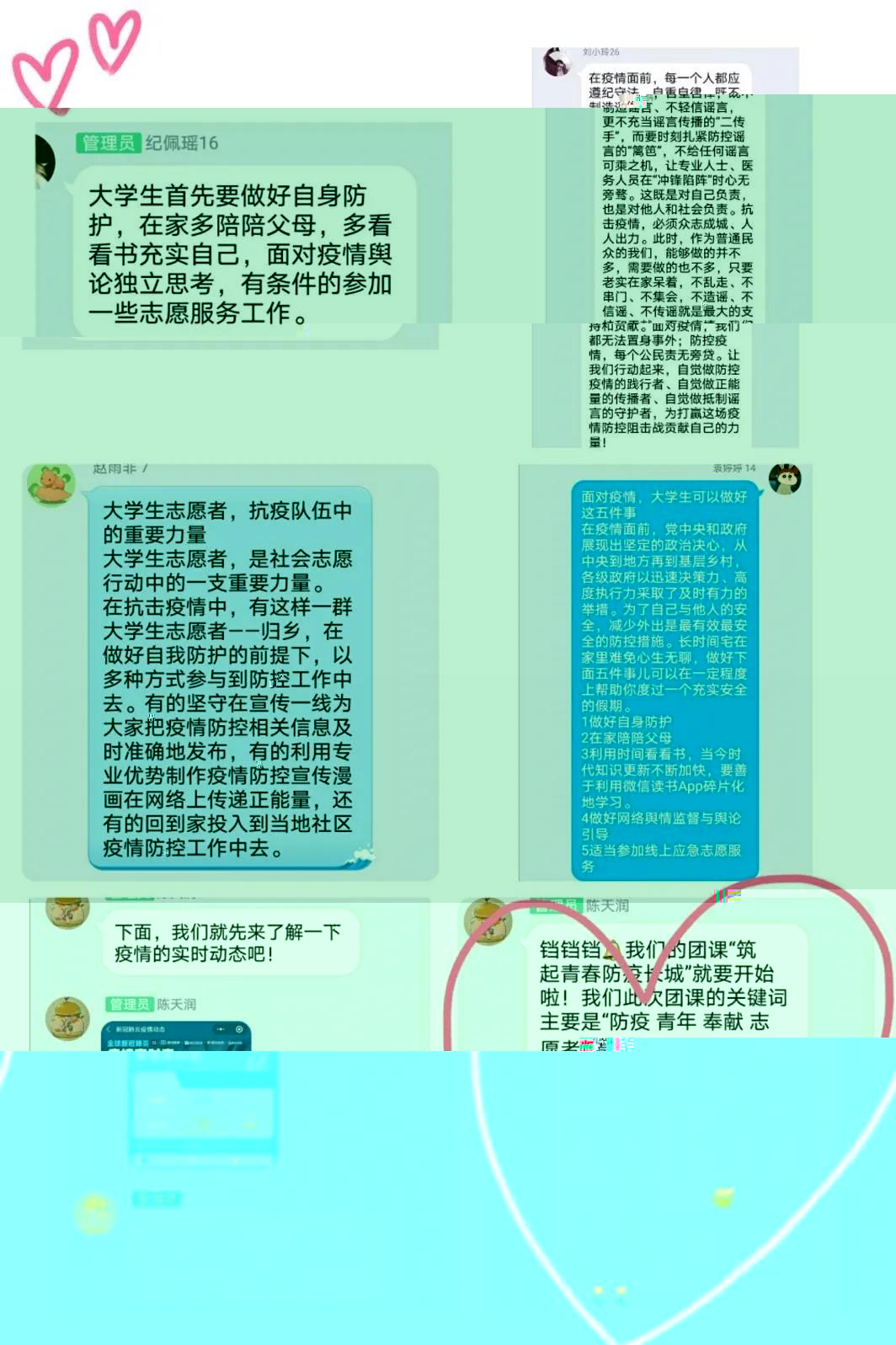 此次疫情,全國人民上下一心,90後、00後青年也發揮了重要作用。習近平總書記給北京大學援鄂醫療隊全體“90後”黨員回信,向奮鬥在疫情防控各條戰線上的廣大青年緻以誠摯的問候。他指出,青年一代有理想、有本領、有擔當,國家就有前途,民族就有希望。公管院2017級廣電一班團支部開展線上團日活動,交流“新時代青年應該做些什麼,怎麼去做”,探讨疫情期間青年學生的志願服務行動,以及如何成長為有理想、有本領、有擔當的新時代好青年。本次團日活動由該團支部書記陳天潤同學主持開展,支部全體團員均積極參與。