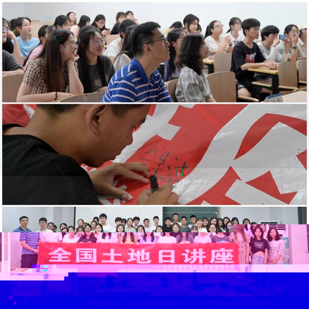 制作了土地日宣傳視頻,在新食堂三樓的大屏幕上循環播放,制作土地日宣傳橫幅,懸挂在西操場。6月24日開展講座,邀請了袁源老師和孫燕老師作為嘉賓,袁源向同學們介紹了國土空間規劃戰略意義,孫燕講解了國土空間規劃體系與設計,與同學們進行熱烈地交流與讨論。通過該講座同學們對土地的相關知識了解更加深入,既增強了專業信心,又提升了學習的興趣,收獲滿滿。其次開展有獎競答環節,四隊學生參加,競賽中同學們查漏補缺、互相學習。最後,所有老師和同學在橫幅上留下了自己的名字,在明信片上寫上了活動感想,紀念本次有特殊意義的全國土地日。