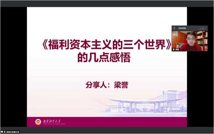 2021年11月15日晚,公管院社會保障系讀書報告會采用騰訊會議的方式順利進行。本期報告會有幸請到南京财經大學梁譽副教授開展主題為《福利資本主義的三個世界》讀書分享講座。報告會由河海大學社會保障系郭劍平、陳際華兩位副教授主持,參會者包括河海大學社會保障系研究生及本科生。