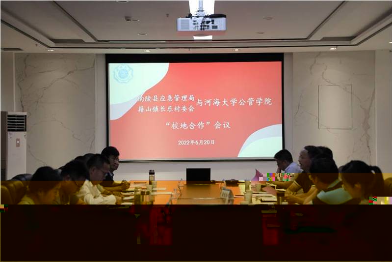 2022年6月20日上午,安徽省南陵縣應急管理局、南陵縣籍山鎮長樂村委會與BV伟德国际官方网站“校地合作”會議在河海大學江甯校區厚學樓401舉行。BV伟德国际官方网站黨委書記蒲曉東、BV伟德国际官方网站副院長陳濤教授、社會學系主任顧金土教授、行政管理系主任曹海林教授、行政管理系副主任李智副教授、社會學系薛芳璿博士以及蕪湖市政法委三級調研員兼籍山鎮長樂村黨委第一書記/駐村工作隊隊長邢毅、南陵縣應急管理局副局長張旭峰、籍山鎮長塘村黨總支第一書記張晶、南陵縣籍山鎮長樂村委會主任汪富、籍山鎮長樂村駐村工作隊副隊長陳修原等出席本次會議。會議由BV伟德国际官方网站副院長陳濤教授主持。