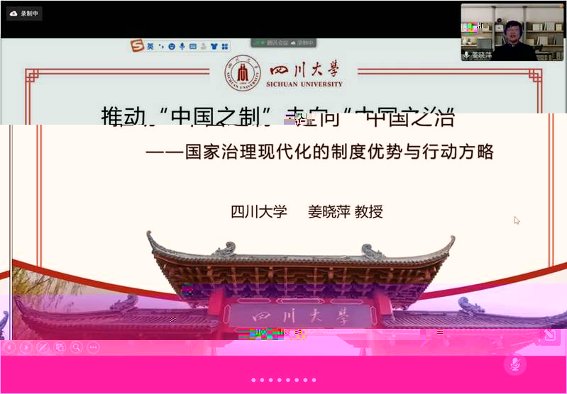 在課程伊始,姜曉萍教授率先破題,解釋“中國之制”與“中國之治”這一字之差的内涵,并引出“如何将制度優勢轉化為治理效能”的課程主線。本場課程共分為三個部分,即“認知國家治理的理論内涵”、“破解中國之制的基因密碼”、“明确中國之治的實現途徑”。姜教授首先帶領大家從全球治理的視角看國家治理,并且從應對新冠疫情情況入手,從國家能力、社會信任和領導能力等方面來引出我國的國家治理的優勢,即建立統一高效的指揮體系、構建全民參與嚴密防控體系、全力救治患者拯救生命、依法及時公開透明發布疫情信息、充分發揮科技支撐短闆。接下來姜教授延續授課脈絡,繼續講解了國家治理的核心概念,國家治理的根本遵循,國家治理的内涵轉換,透視國家治理的六個維度,厘清國家治理體系和治理能力的内在邏輯,聚焦國家治理的核心問題等方面,引起了同學們高度的關注和興趣。