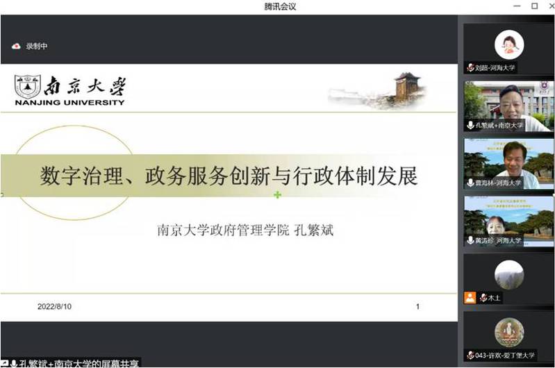 8月10日下午,江蘇省研究生“新時代高質量發展與公共治理轉型”暑期學校第九場課程“數字治理、政務服務創新與行政體制發展”順利開課。課程主講人為南京大學政府管理學院孔繁斌教授。主持人為BV伟德国际官方网站曹海林教授,來自海内外50餘所高校的100名學員以及公共管理學院師生參加。授課開始前,曹海林教授對孔繁斌教授出席暑期學校表示熱烈歡迎,并向暑期學校師生介紹了孔繁斌教授的研究領域及豐碩成果。