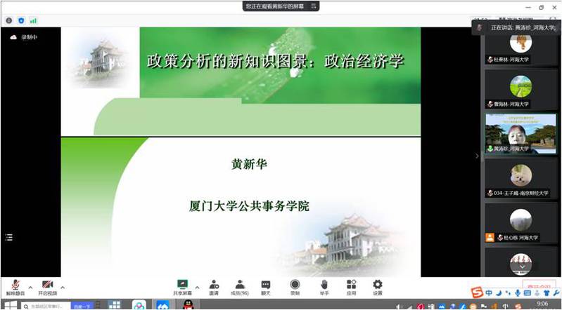 8月11日上午,江蘇省研究生“新時代高質量發展與公共治理轉型”暑期學校第十場課程“政策分析的新知識圖景:政治經濟學”順利開課。課程主講人為廈門大學公共事務學院黃新華教授。主持人為BV伟德国际官方网站黃濤珍教授,來自海内外50餘所高校的100名學員以及公共管理學院師生參加。授課開始前,黃濤珍教授對黃新華教授出席暑期學校表示熱烈歡迎,并向暑期學校師生介紹了黃新華教授的研究領域及豐碩成果。