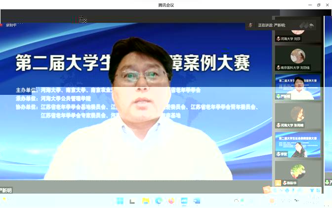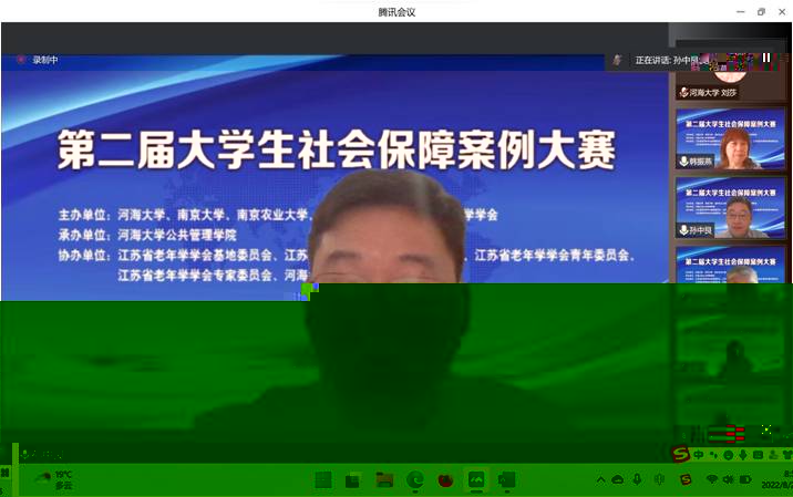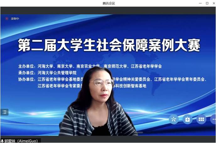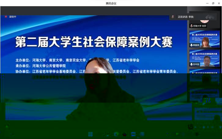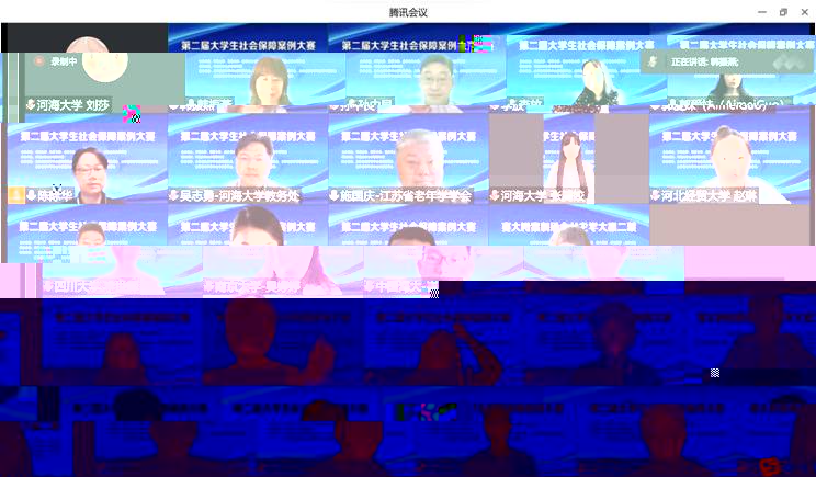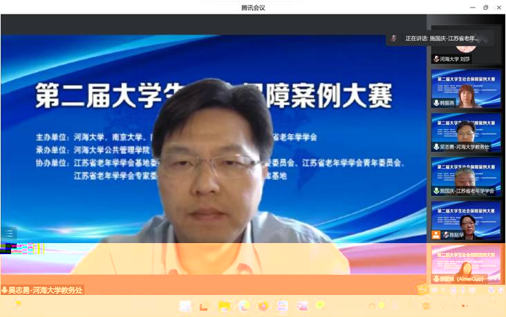 為積極應對人口老齡化國家戰略,推動新時代社會保障高質量發展,加強校企合作,提升勞動與社會保障及相關專業大學生的理論基礎、實踐能力與綜合素質,“第二屆大學生社會保障案例大賽”于2022年8月20日以線上騰訊會議方式舉行。本次大賽由河海大學、南京大學、南京農業大學、南京師範大學、江蘇省老年學學會聯合主辦,江蘇省老年學學會基地委員會、江蘇省老年學學會精神關愛委員會、江蘇省老年學學會青年委員會、江蘇省老年學學會專家委員會、河海大學科協科技創新智庫基地協辦,BV伟德国际官方网站承辦。全國各地有40多所高校90支隊伍約300人參加了本次大賽。河海大學教務處副處長吳志勇教授、江蘇省老年學學會會長施國慶教授、南京大學勞動人事與社會保障系主任嚴新明教授、南京農業大學社會保障學科負責人李放教授、南京師範大學社會保障學科負責人郭愛妹教授、BV伟德国际官方网站副院長孫中艮教授、河海大學社會保障學科負責人及系主任韓振燕教授、河海大學社會保障系副主任陳際華副教授以及來自南京大學、四川大學、西安交通大學、廈門大學、南京農業大學、西華大學、中南财經政法大學、雲南大學、中國海洋大學、西北工業大學、上海師範大學、蘇州大學、南京醫科大學、西南醫科大學、江蘇師範大學、河北經貿大學、南京師範大學和河海大學等高校的10支隊伍和部分參賽學生約80人參加了線上決賽和頒獎儀式。