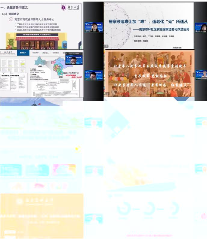 線上比賽環節由BV伟德国际官方网站社會保障系副主任陳際華副教授主持。案例評選排名前十的參賽隊伍分組依次進行路演,并接受友隊提問及回答。這些案例作品分别是授之以“魚”不如授之以“漁”:助殘就業模式的轉型升級——以南京市“雨花睿澤”機構為例(南京大學);頤養天年:“醫”何以嵌入社區居家養老服務?——以成都市Z醫院為例(四川大學);制度賦權,培訓賦能與行動選擇:南京市就業培訓政策的促進效應研究(南京農業大學);聽見“星星”的“回聲”——孤獨症家庭喘息日服務(河海大學);西南醫科大學釀造歲月芬芳,溫暖生命年輪:CCRC實踐何以實現養老升級——以四川省L市春江酒城嘉苑為例(西南醫科大學);老吾老以及人之老:人口老齡化背景下黨建+頤養之家如何引領農村養老模式變革——以江西新餘渝水區為例(河北經貿大學);面子與現實的抉擇——醫養結合機構護工短缺之困(南京醫科大學);從“緊急配藥”看社會工作介入應急救助——以昆山市L社工機構為例(江蘇師範大學);居家改造難上加“難”,适老化“無”所适從——南京市N社區實施居家适老化改造困局(河海大學);敢問路在何方——江蘇省老年醫院不同醫養合作模式的探索與實踐(南京醫科大學)。參賽隊員們一方面精心展示案例作品場景及分析依據和論證,一方面圍繞案例主題與内容積極精準回應友隊問題,雙方唇槍舌戰,你來我往,情緒高漲,場面和諧激烈。賽出了知識,賽出了能力,也賽出了友誼!