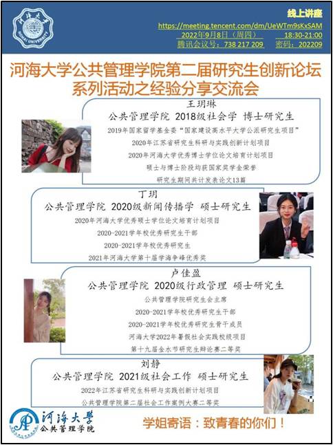 邀請學院4位高年級的博士/碩士研究生,分享各類科研項目申報與學術研究經驗,如國家留學基金委“國家建設高水平大學公派研究生項目”、江蘇省研究生科研與實踐創新計劃項目、河海大學優秀博士/碩士學位論文培育計劃目、河海大學暑期社會實踐校級項目等。