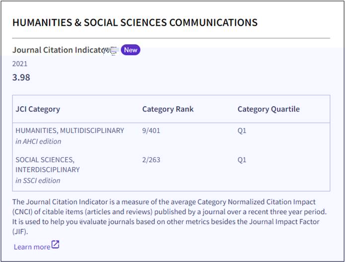 Humanities & Social Sciences Communications(HSSC)是Nature旗下唯一面向人文社會科學的刊物,被SSCI和A&CHI共同索引,具有重要影響力。HSSC期刊引用指數(Journal Citation Indicator)為3.98,在人文等多學科領域的400餘種期刊中排名第9,在社會科學等多學科領域的263種期刊中排名第2.此項科研成果有助于提高我校社會科學學科在國内外的學術影響力。
