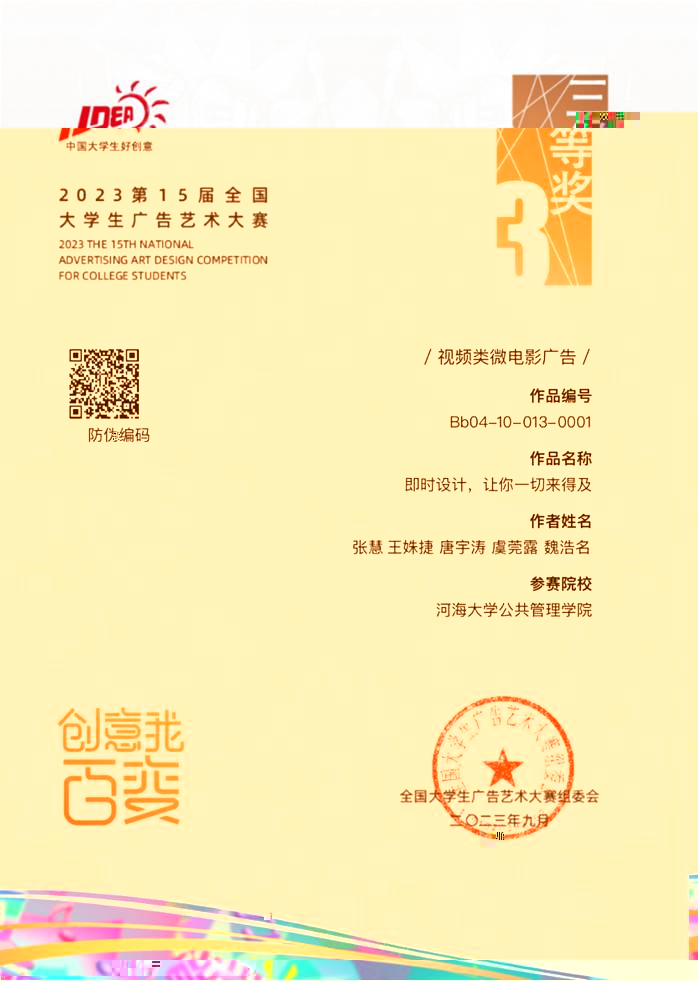 020級廣播電視學張慧團隊的視頻類微電影廣告作品《即時設計,讓你一切來得及》獲全國總評審三等獎。