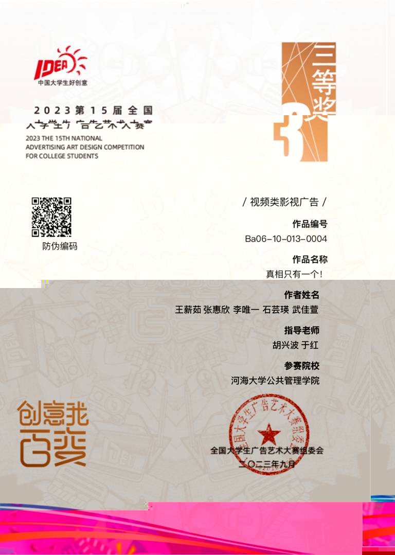 2022級播音與主持藝術專業王薪茹團隊的視頻類影視廣告作品《真相隻有一個!》獲全國總評審三等獎。