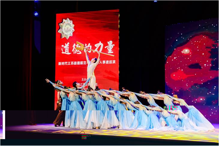 最後,演出在我院播音與主持藝術專業的程昕源、趙子健同學以及河海大學大學生藝術團共同演繹的歌舞《在道德星空下前行》中落下帷幕。全場掌聲雷動、經久不息,程昕源、趙子健兩位同學的表現得到了與會領導和老師的一緻好評。