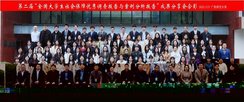 2023年12月9日,響應黨中央有關大興調查研究之風的要求,為促進社會保障學科發展,由中國社會保障學會、廣西師範大學主辦,中國社會保障學會教學委員會、廣西師範大學政治與BV伟德国际官方网站承辦的第二屆“全國大學生社會保障優秀調查報告與案例分析報告成功分享會”在廣西師範大學成功舉辦。我院社會保障系主任韓振燕教授、勞動與社會保障專業2021級本科生陳莉、吳佳斌、鄧美玉和數學學院闵芷瑞同學應邀前往廣西師範大學參加會議。