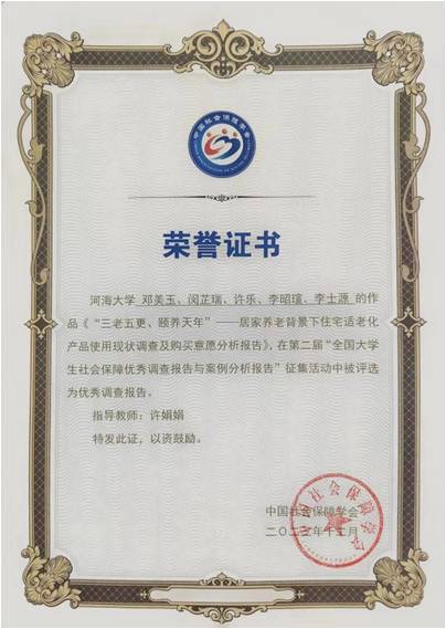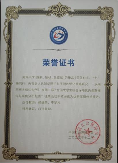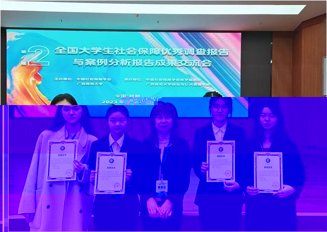 由我院社會保障系韓振燕老師、李夢凡老師指導,勞動與社會保障專業2021級本科生陳莉團隊(成員矯揚、吳佳斌)撰寫的《留住時光,“憶”路同行:失智老人認知症照護與幹預的優化策略研究》被評為“社會保障優秀案例分析報告”;由商學院許娟娟老師指導,勞動與社會保障專業2021級本科生鄧美玉團隊(成員闵芷瑞、許樂、李昭瑄、李士源)撰寫的《三老五更,頤養天年——居家養老背景下住宅适老化産品使用現狀調查及購買意願分析》被評為“社會保障優秀調查報告”,并受邀在大會上分享交流。