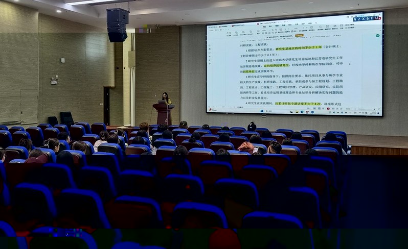 研究生培養秘書田然老師針對基地實踐期間的學籍管理、論文工作環節和日常生活管理等方面向同學們做了詳細解讀。在基地實踐期間,每位研究生需聽取規定次數的專題講座,登陸系統填寫各環節日志和記錄,同時與校内校外雙導師保持緊密聯系、推進學位論文撰寫工作。在日常生活管理方面,田老師提醒各位同學認真學習《河海大學全日制專業學位碩士研究生基地實踐手冊》,遵守學校和基地單位雙方的制度規定,注意用水用電安全。