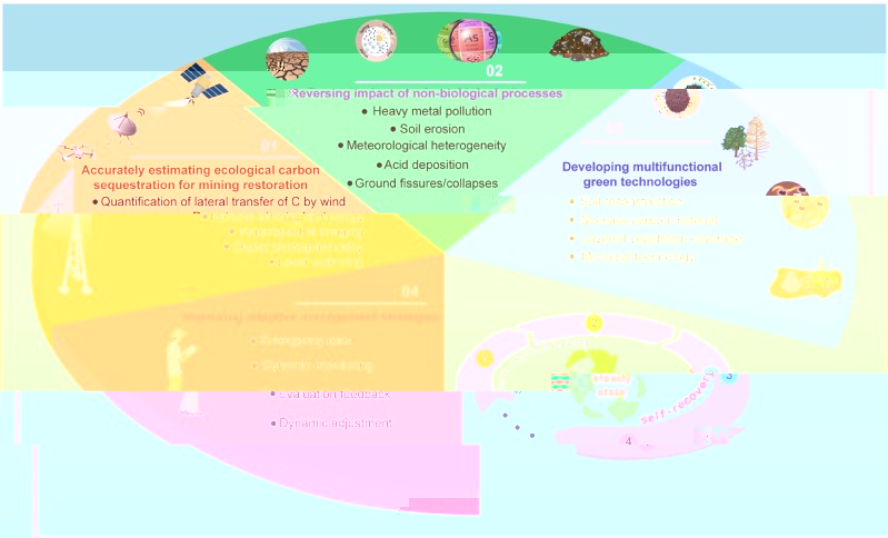 該研究以全生命周期和适應性管理為切入點,指明支撐未來退化礦區生态碳彙持續提升的方向和關鍵技術:①準确估算礦區修複生态碳彙。精準量化不同時空尺度礦區碳平衡的變化,确定優先修複或實施修複項目的位置,并實現精準預測與監測;②扭轉非生物過程的影響。将酸沉降、氣候變化等非生物過程引起的礦區碳失衡降至最低,了解非生物過程對礦區碳循環的相對貢獻;③開發多功效的“綠色”技術。協調土壤重構、生物質碳材料、分層植被覆蓋和碳基因定向篩選等技術,在短時間内最大化礦區修複的固碳效應,實現高碳彙的礦山近自然演替;④完善适應性管理策略。依據礦山恢複程度的衡量與緊急方案的應對,建立綜合和整體的适應性管理框架和行動指南,促使礦區生态系統恢複達到穩定的自我維持、自我複原的狀态。