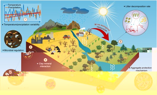 該研究耦合氣候-土壤-植被-微生物互作過程,闡述了植被光合作用/光合碳分配、植物根系分泌物和植物死亡殘體輸入、團聚體保護、黏土礦物結合和微生物代謝及碳轉化等礦區生态修複碳彙形成的複雜機制(圖2)。為應對全球氣候變化和碳中和願景下礦山生态修複決策和固碳增彙最大化提供理論依據。