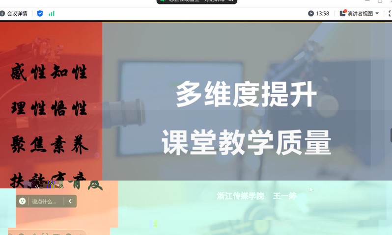 王一婷教授是《播音主持創作基礎》國家一流課程負責人,也曾獲首屆高校教學創新大賽一等獎,浙江省高校青年教師教學競賽特等獎,被評為浙江省我最喜愛的高校優秀思政課教師,浙江省首批網絡教育名師,有着豐富的教學經驗。在報告會中,王一婷教授圍繞多維度提升課堂教學質量的方法層層展開内容分享,教學設計的路徑、課程思政的元素、課堂感染力的表達,不僅有理論,還有豐富的案例,可操作性的指導。
